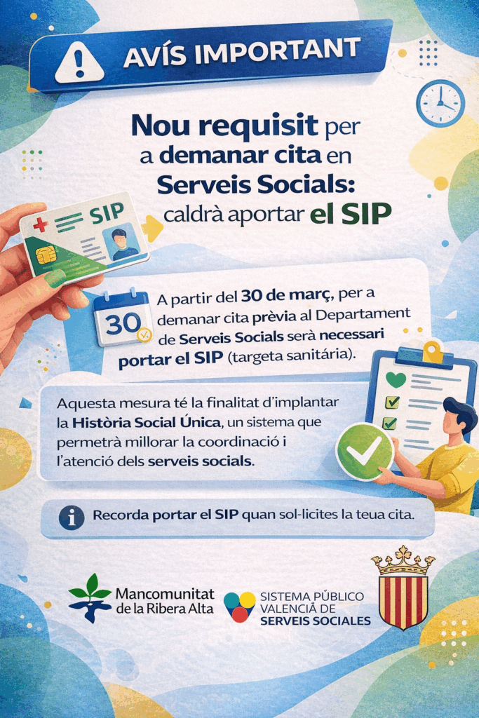 A partir del 30 de març, per a demanar cita en Serveis Socials serà necessari presentar el SIP (targeta sanitària). Esta mesura ajudarà a implantar la Història Social Única, millorant la coordinació i l’atenció dels serveis socials.